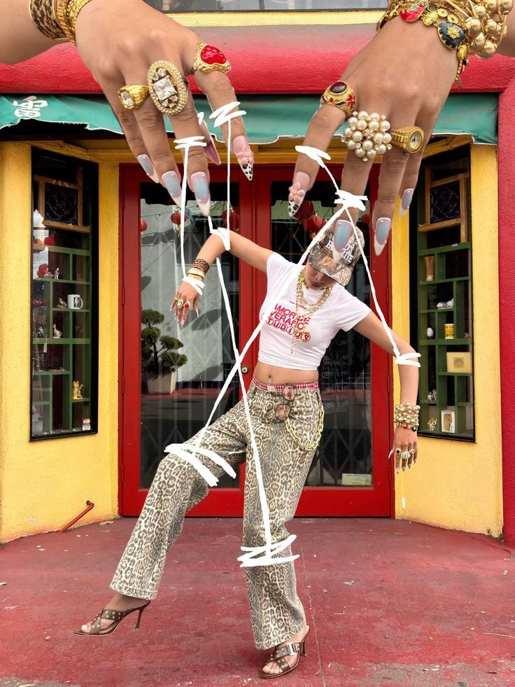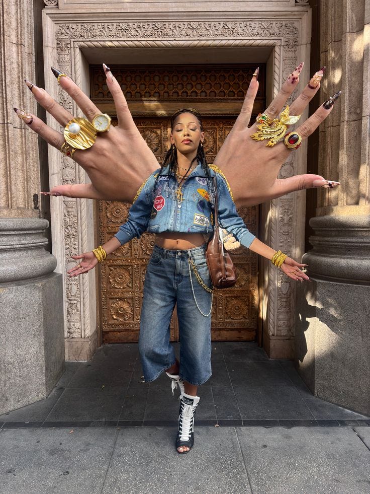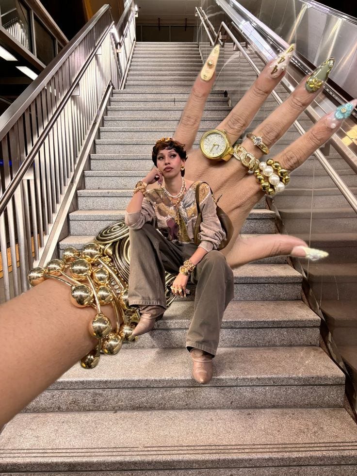 They’re giving dream-sequence main character directed by a MySpace angel with Photoshop 7. We’re seeing fashion as fantasy: giant gold rings, cartoon-scale hands, layered textures, poses that bend dimension. It’s campy. It’s creative. It’s cool. It’s surrealism. All of it. Weird, beautiful, chaotic.